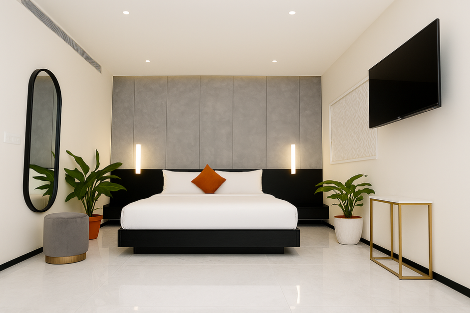 Our Superior Suite is our most spacious offering with warm, earthy tones, soft lighting, and thoughtfully curated décor. Plush sofas, wooden accents, and ambient lamps make the living space feel like home. The private balcony is a highlight, outfitted with potted plants—perfect for morning coffee or unwinding in the evening breeze.